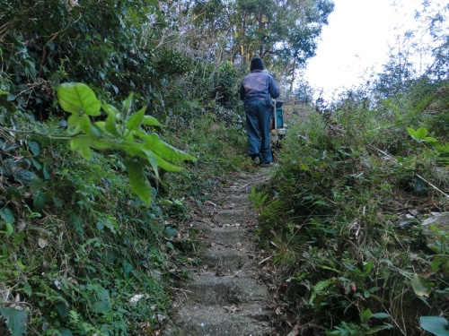田舎の墓地は昔から高台の眺望の良い場所にあるのが一般的でその高台までは、ほとんど徒歩で行くことしか考えられておらず細い道だったり階段だったりすることが多く、仕事上では難所現場が多い。 今日の現場も歩いて上るだけでも息が切れるほどの急斜面で石材を上り運搬するのは比較的安全に作業は行えるけど墓石移設のため石材運搬車で坂道を下す作業だったので運搬車と石材の自重も加わり、とても危険を伴う作業だったが安全管理第一で、何とか無事に墓石移設の作業を済ませることが出来た。難所の運搬路
