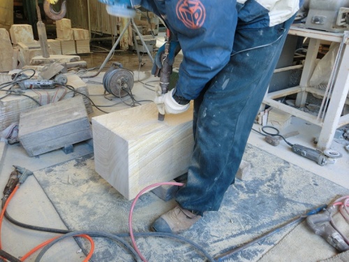 11月に開催した三代目(息子)の初の個展【石あかり展】で正面入り口に飾っていた「いらっしゃいませ」の大きな作品を「洋風に作って」と、熊本市内のカフェレストランのオーナーさんから注文があっていたけど、”洋風”のイメージがなかなか湧かずずっと日延べになっていたけれど、やっと制作に取り掛かった。制作中の店頭に飾る木目石彫刻 自分のアイディアで、黒御影の板石にシンボルマークを彫刻してはめ込み三代目のアイディアで、全体をレンガ調に仕上げることによって洋風感を出し【いらっしゃいませ】の文字を【WELCOME】として仕上げる予定です。レンガ調 天草木目石の全面を小叩き仕上げにして、更にレンガ調の模様に仕上げたら連鎖する木目調の旋律の流れ模様の中に、素晴らしい洋風の趣が醸し出されてきた。後は、彫刻の技術を活かした三代目の作業になるけれどこりゃ~、仕上がりがとても楽しみになってきました。