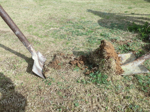 毎年2~3月になると地中で生きているモグラくんが出現し(普段は地中深い部分で生きているらしいが)生きるため、畑だろうが芝生だろうが、お構いなしに表土に近い部分を掘り進め畑の作物は根元から表面ギリギリまで食い荒らし芝生に至っては、掘り起こした土を芝生の表面に盛ってくれるもんだから芝生も凸凹状態となって、枯れてしまいとても困っている状態だった。 今日、工場敷地内の芝生をたまたま見たら芝生の表面がモコモコと動き、盛り上がっているのを発見して【今、まさにモグラがそこにいる】ことを確信しモグラの通路だと思われる先と後に三代目(息子)と息を合わせ素早くスコップでズバッとモグラの地下通路にスコップを突き刺した通路をスコップで遮断見事にモグラ捕獲捕獲したモグラくん しかし、今日はちょうど東日本大震災から5年目だし、殺生は如何なものか三代目(息子)が、自然の中に釈放してやった。