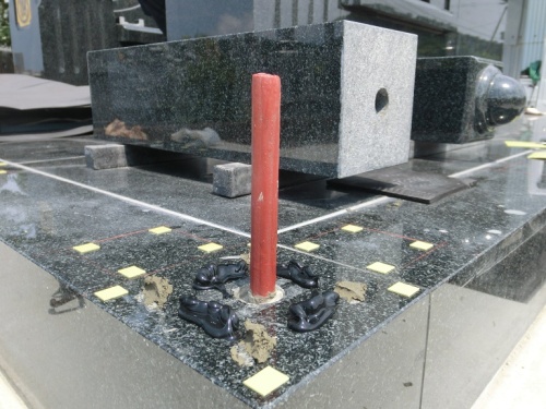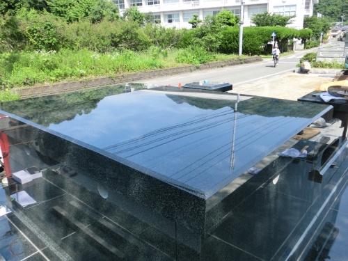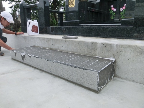 4月26日から取り掛かった大々的な基礎工事も先日終わり土木作業左官作業と取り組んで来て、やっと石材施工作業に取り掛かった。土台施工 外柵(帯石)と、地上納骨式墓石の間は板石を貼り板石の目地は、伸縮性のあるコーキングを避け目地セメント仕上げとした。板石施工 そして、セメントを用いて施工した後、エフロレッセンスという白樺現象が現れ、石灰質の白い塊が石の表面に出てきたりすることがあるので我が石材店では、セメントを用いる場合【エフロカット】という溶液を用いエフロレッセンス(白樺現象)の出現を予防している。エフロカット ひとつの墓石を完成させるまで、出来る限りの知恵を振り絞り、完成した墓石が天災にも耐え、いつまでも綺麗なかたちで存在し続けるため常に誠心・誠意・誠実を以って学習しながら一貫し続けています。 明日は雨の予報なので、工場で文字彫り作業に集中できます
