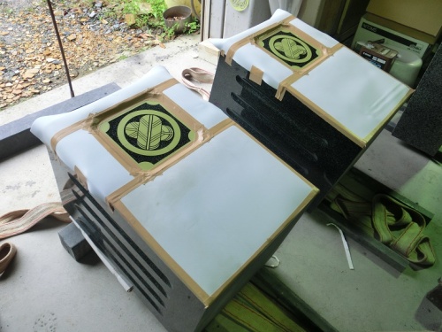 一日中雨が降り現場作業は出来なかったが【雨の日に文字彫刻をする】ことにしていたので実行自分が文字彫りの準備作業をして、三代目が彫る作業をして二人三脚。文字彫り準備ブラスト彫刻 文字や家紋などを間違えないよう、何度も確認して臨んだ。 しかし、福岡管区気象台発表によると「今日、熊本県を含む九州北部が梅雨入りしたとみられる」と発表したが今後は天気予報とにらめっこしながら作業を進めて行かなければならない。