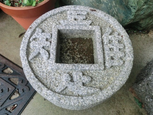 銭型つくばい(手水鉢)に彫られている【吾唯足知】(われただたるをしる)の文字は漢字の中の下左上右に共通する【口】の文字を中心に右回りに読んで行く。 三代目は、12年前高校を卒業後愛知県岡崎市に石材加工の修行に行き間もなく【菊鉢】や【銭型つくばい】などの作品を作ったが修行中のいくつかの作品は、三代目の修行記念として我が家で買い取った。修行に行って間もなく作った【銭型つくばい】 今を生きる我々にとっても、とても奥深い意味合いがあり、食物や物品の価値感や、精神的な考え方までにも追及できる言葉。 一昨日の父の日、娘夫婦が大好きな【焼酎】をプレゼントしてくれた。娘曰く、「お父さんへのプレゼントは迷わなくていい」と毎度焼酎を頂くけど、今回の焼酎は初めて目にした芋焼酎【吾唯足知】だった。芋焼酎【吾唯足知】 自分にとっては、高級過ぎる焼酎で足るどころか大満足なので封を切らず、大切に飾っておこうかとも思ったが、4月14日発生した熊本地震とその余震、そして今後の不安や昨夜の猛烈な雨や土砂災害のことを考えれば、割れてしまうかも知れないし自分の身にも何が降りかかって来るかわからない。だから、勿体ないけど今日も汗だくになり仕事を頑張ったので今夜は、ひと文字入れ替えて【吾唯樽知】で「頂きま~す」 ん~~~旨い!