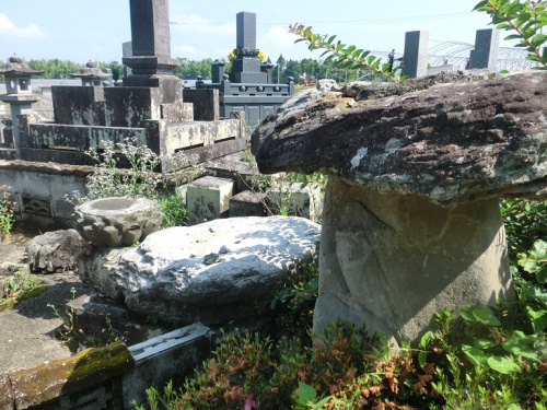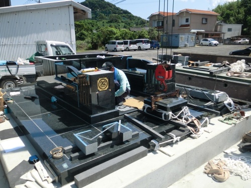 県内植木町まで通勤ラッシュとも重なり行きは2時間半掛かり夏日の現場で熊本地震で被災したお墓の修復作業を行った。 今回は、大きな自然石で出来た石灯篭が隣の墓所に倒れるなど迷惑を掛けているということで最優先的に復旧作業を行った。倒壊した自然石の灯篭倒壊した丸墓前灯篭 自然石の灯篭の笠は重量が400kgあり、5段に伸ばしたカートクレーンでやっと吊れる重量で、もし吊れなかったら出直しの作業となるところだった。灯篭の笠を設置 高さもあり、最上段の玉石の施工が困難だったので臨機応変、三代目(息子)をクレーンで吊っての作業を行った。最上段の施工 そして、倒れていた丸墓前灯篭を修復した後丸墓前灯篭の倒壊によって墓石本体に10カ所以上も欠けてしまった部分があり特殊な粘土状の補修剤を用いて補い、石材の柄に合わせ着色して修復を終えたが欠けてしまった石材破片が残っていなかったので時間を要してしまった。修復が終わった灯篭と墓石 最終的に「どこが割れて、どこが欠けていたの」というほど一見して分からないほど綺麗に修復出来た そして、周りには石材店が修復した墓石がいくつもあったが接着剤やコーキングでつなぎ合わせただけの修復が多くありキズは目立つし、色の違うコーキングが、はみ出ているし「何じゃこりゃ~」みたいな修復が多く見られた。修復作業にも技術の差が出て来るのです。