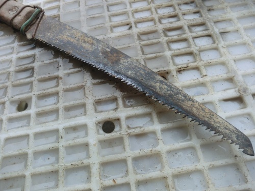 朝から雨が降り現場作業にも行けず「何をしようか」考えたときに、汚いノコギリを思い出し木の根切り専用に使用していたノコギリを金ヤスリで目立てを行い金属部分も砥石で研いだところ見事な切れ味に復活した汚い根切り専用ノコギリ歯の目立てをして研いだ 普通なら捨ててしまいそうなノコギリだったけど、まだまだ使えます。そのノコギリ一本の目立てによって気持ちがエスカレートして他のノコギリや剪定ハサミ、肥後小刀、ナイフ、鎌などあるだけの様々な刃物を一日掛かりで研ぐこととなった。研いだ刃物 しかし、剪定ハサミを分解して研いでいる途中自分の指を切ってしまったことは大失敗だった。血液さらさらの薬を呑んでいるので、なかなか出血が止まらなかった。