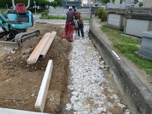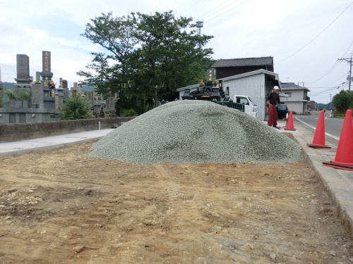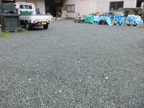 梅雨入り宣言後、晴天の日が多く現場作業は捗っていて追加注文のビシャン叩き仕上げで加工した階段(踏み石)も今日施工することが出来て、撥水剤を塗って仕上げることができた。二度手間ではあったけど、接地面の傾斜角に合わせて再加工したので施工し易かったし、見た目も綺麗に収まった。施工した階段(踏み石)に撥水剤を塗る また、完成した墓石の一部に移設するお地蔵さんは苔で汚れていたので工場に持ち帰り、企業秘密の薬液で苔を溶かし、高圧洗浄機で洗った。おじぞうさんbeforeおじぞうさんafter このように綺麗になるのは、苔だらけの墓石も同じことでお墓のクリーニングも、我が石材店の超得意分野なのです。 午後からは、隣の墓所にメン砂利を敷き込むため土の撤去作業をし2トンダンプ山積三台を搬出し、明日の砂利の敷き込みに備えた。土の取り出し 明日は、一日掛かりで2トンダンプ5台分の砂利の敷き込む予定だったけど「どうしても明日しかダメ」という飛び込みの依頼が舞い込み明日の午後から大型ダンプをチャーターし、7立米のメン砂利を一気に敷き込む段取りに変更した。(結果オーライかな)