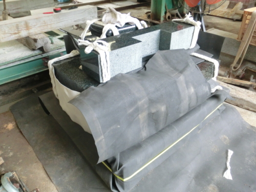 解体し、クリーニングしたあと、金箔貼りなどを終えた石碑を再施工してもらう大阪府の石材店へ送らなければならないが運賃をいかに安く抑えるかいろいろ調査した結果ただ単にパレットの上に積載するだけよりきちんと木枠の箱で梱包すれば安くなるという情報を入手したのでこちらとしては手間のかかる作業ではあったけど強度とバランスなど、積載順と配列を考えながら梱包した。養生しながら木製のパレットに乗せるラップなどで養生木枠で梱包 この作業だけで、三代目と二人で一日掛かりの作業となったがあとは、大阪の石材店のスタンバイを待って運送会社へ持ち込み無事に届くことを願うのみ。