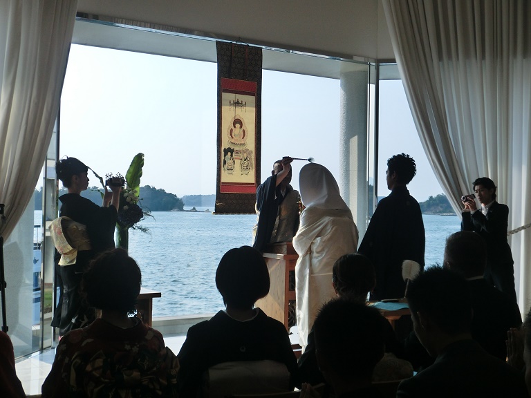 今まで神前とか人前結婚式は何度も経験があるけど昨日(27日)、友人の娘さんの結婚式に案内を受けお坊さんによる仏前結婚式を初めて経験した。仏前結婚式 ご先祖様あってこそ今の新郎新婦の姿が在るので、問題ないと思うし仏教徒がチャペルで賛美歌を歌うより筋が通っていると思った。 披露宴では、精進料理・・・でなくて天草らしく鯛や伊勢海老の刺身など最高のコース料理に舌鼓を打ちふたりの門出を祝う一人として最高の時間を過ごさせてもらった。伊勢海老の刺身 夕方5時からの結婚披露宴で、お開き後はそのまま二次会へ流れ込み6時間呑み続けたが、今日午後からの商談はバッチリ