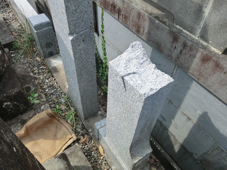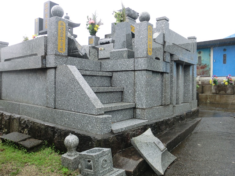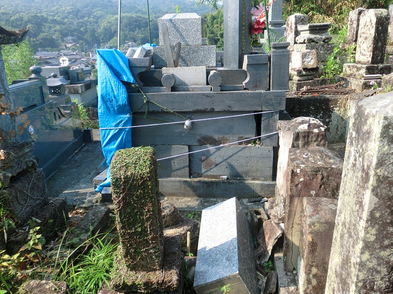 熊本地震で被災した墓石は熊本県全体で数万基情報によれば、全体の20パーセント~30パーセントの復旧が終わったが受けた数にもよるけど、まだまだあと何年掛かるかわからない石屋もいる中我が石材店では、70パーセントの修復すべき墓石の数だけは終わったけど残った30パーセントの復旧が厄介と言うか大掛かりな作業が多いため実質、まだまだ20パーセントにも至っていないのかも知れない。 これからは、「いつ来てくれるの?」の問い合わせに対し「すみません、努力はしているんですが、順番待ちでお願いします」その言葉で受け答えさせてもらうしかないのです。m(_ _)m例えば、9月になってから赴く大型被災墓石(美里町)この古くて大きな墓石を修復するには、数日かかってしまいます。