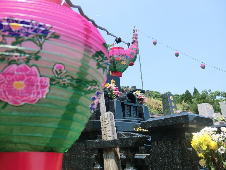 今年3月26日に亡くなった義母の初盆を迎えるにあたりお墓に電球で灯す提灯を、電気屋さんと一緒にセットした。お墓にセットした提灯