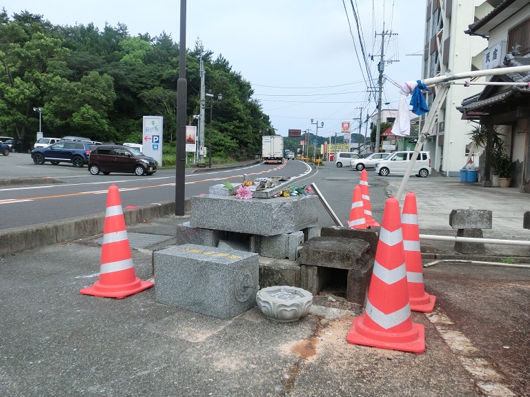 昨日夕方、上天草市の国道で85歳くらいの男性(老人)が運転する軽乗用車が地蔵尊に衝突し、石造りの地蔵尊と台座は3-4mぶっ飛び石材にぶつかった軽乗用車は大破し、廃車となったが運転していた男性は左手にかすり傷を負っただけで無事だった。事故現場県警の手によって片付けられた石材 全ての石材と軽乗用車は全損状態となったのに対し運転手が無傷だったことは、このお地蔵さんが身代わりになったと思う。なぜなら、三十数年前にここで死亡事故があって、地蔵尊を建立されてから、同じ場所で同じような事故が4回発生しているそうだが地蔵尊は全損の傷を負っても、一人の負傷者も出ていないそうでこのお地蔵さんが【クッション】の役割を果たしているかのようだ。 昨日の事故も(今までの事故も)居眠り運転で、ブレーキ痕が全くなくもし、この場所にお地蔵さんがなければ、そのまま先にある電柱に激突し4回の事故は死亡事故につながる大参事となっていたと思われるのでこのお地蔵さんは、【厄除け地蔵尊】として祀られているけど、最近では【身代わり地蔵尊】と呼ばれるようになっていた。
