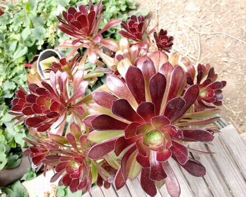黒法師です。こちらは、庭でガンガン日に当てていた株。黒くカッコいい感じになっています。暑くなってきているので、半寝状態です。こちらは、玄関に置いていた株。日当たりが悪いせいで緑です。横から見たらこんな感じ。個人的には黒い姿が好きなのですが、玄関多肉として大きな黒法師は存在感抜群なので現在は玄関に置くようにしています。週替わりで庭と玄関とを置き換えればちょうど良いのかな?黒法師の成長期は冬です。しかし、寒さに弱い為に5度以下だと元気がなくなります。なので真冬は部屋に置いて寒さから遠ざける温室育ちの子です。ちなみに、休眠期の夏以外は多肉植物にしては水を週一くらいの間隔で与えています。触って葉がしなぁっとした時が水やりのタイミングかな?多肉植物は水やりしすぎると枯れると言われるので最初の頃は水をやりなさ過ぎて元気をなくしていました。水が少なかったのですね。で、育て方のコツさえ分かれば百均のひょろい株が今ではこんな感じに成長しています。すでに十年以上の付き合いですが、百円で長く楽しめているコスパ抜群の多肉ちゃんです。**********************************************前回の記事はこちらから。 ↓月影の今(^▽^)ノhttps://plaza.rakuten.co.jp/urayan26/diary/202505010000/**********************************************Instagramやっています。気になる方は、こちらからどうぞ。@pokoa08