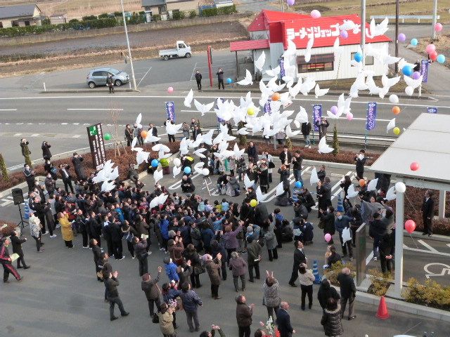 外に子供園・小中学生が移動し、ハトバルーンのリリースです。