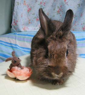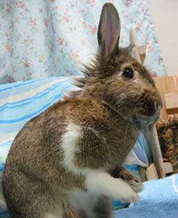 おっ!キレイキレイしてる カメラ カメラっと (真剣にキレイキレイしています) あらっ、顔デカイ (≧∇≦)キャハハ・・・1等身半だよ!! ちょっと~、黙って聞いてれば、 顔でかいだなんて失礼な (これもデカイ顔) ごめん!お詫びにナデナデしてあげるよ ナデ ナデ ・ ・ ・ (気持ち良さそうだけど、何かに似てる??) んっ! (≧∇≦)キャハハ・・・おにぎりみたい!? あのねぇ~! これ見て、みんな私の顔大きいと思っちゃうでしょ こう見えて私、結構スタイルいいのよ!! 全身写真載せてよねっ 全身写真!?あったかなぁ~? これでいい? ねっ!顔大きくないでしょ (本当は、うさみみ よその子と比べると小顔です) うさぎって角度や体勢で、顔が妙に大きく見えたりするんですよね