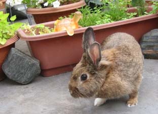 昨日は私、子スズメに少しジェラシー感じちゃったんだけどねっ ポメミミと話した時の事思い出したの! ポメミミは私に 「小さい者と弱者には優しく」 って言ってたの だから私、スズメさんと友達になるのです うさミミ、思い立ったら即行動!早速ベランダへ スズメさ~ん、いますかぁ? 確か昨日は、あっちにいたような・・・ 珍しくハーブの香りにも負けません あっ、来た!? ベランダには寄らずに、逃げてしまいました ねぇ~何で来ないの? 今日もお約束の、お鼻がハート ミミがいるから、スズメは怖くてこれないのよ! えっ 私が怖いの こっそり隠れて待ってれば、たぶん来るよ こっそり 草の陰から覗いてるつもり(≧m≦) 隠れて・・・ 実は、隠れてハーブ食べてます ちょっとぉ~、ナスタチュウムとルッコラの花全部食べたでしょ! ばれちゃった やっばりハーブとお花には・・・ うさミミさ~ん、スズメさんと友達になるのではなかったの?