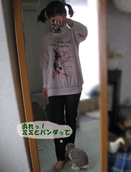 ミミとパンダロップも復活しました(笑)鏡越しにあの方と ロップだったの??? でも、私の方が耳が長いのです ほらっわかってます~でも、ミミとパンダの方が長くなるかもしれませんよ~そうそう、↑のうさぎのカットソーはキリバンニアピン賞でまるおママさん から頂きました。素敵なイラストと一緒に落ち込んでいる時に届いたので、とても感激でした。ありがとうございました