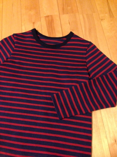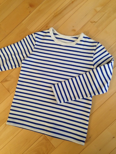型紙 パターンレーベル キッズTシャツ 130布地 プロート 16/2天竺 ネイビー×レッドそろそろサイズアウトなのに、その上の型紙が手元にないため、まだ130サイズで作っています。久しぶりにつくるキッズT。見開きの型紙で、ボーダーものが裁断しやすいということを思い出しました。ネック部分をばっちり決めたかったので、定規をあてながらまち針をうち、ていねいにしつけして縫いました。ボーダーの柄合わせは、少しずれてしまったけれど、気にするのは作った私だけ。よしとします!