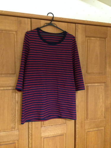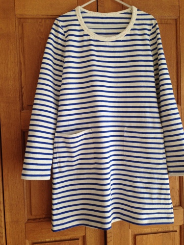型紙 パターンレーベル デイリーワンピ布地 プロート 16/2天竺ボーダー オフ×マリンブルー今年の初縫いは自分服から。裁断をしていると「誰の~?」姉妹で同じ質問をされました。3枚目のデイリーワンピは長袖、チュニック丈、丸底ポケット2個で作りました。1枚目と2枚目は、七部袖だったので、手首が寒くて仕方がないので、長袖でようやく作れました。ネック布は、カラフルネップのスパンフライスですが、どこで購入したのか覚えていません。サイズはLサイズですが、身長が低いので(155.5cm)袖丈-1cm短くしました。