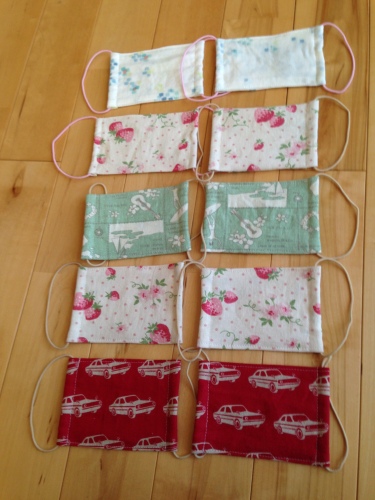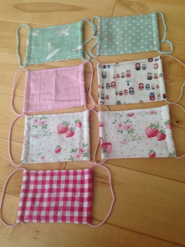 買いに行こう行こうと思いながら、面倒で行けなかったので、結局作ってみることにしました。家にあるもので、いろいろ作れました。作り始めると、単純で楽しい作業。手順が少ないのに、やっぱり間違えたりしました。小学生になった次女。マスク屋さん~といいながら、並べて楽しんでいました。作り方。上下の縫い代5mmのところを、型紙を1cm足して、1cmの縫い代で作りました。マスクゴムは、ピンクとベージュです。