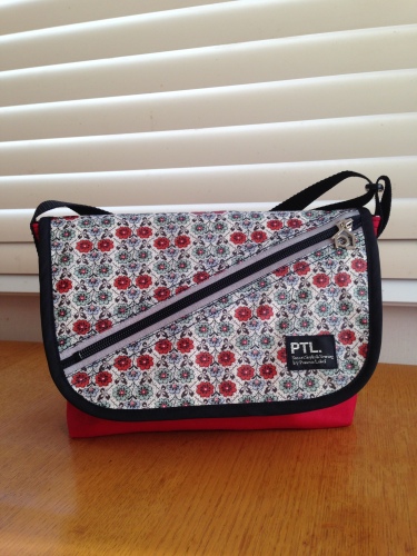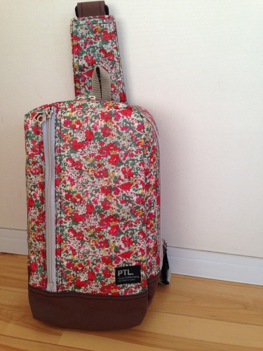 型紙 パターンレーベル フラップショルダーS布地 リバティCardeliaつや消しラミネート・銀河工房11号帆布 レッド3個目のフラップショルダーです。今回はブラックファスナーなので、雰囲気ががらっと変わりました。布選びも迷いに迷って、新しい布も買おうかどうか迷って、結局、家布で作りました。初めて「PTL」タグも使ってみました。いつもの「ラグジュアリータグ」もかなりのお気に入りですが、このロゴタグもかっこいいです。今回はフラップのポケットの中を変えてみました。中フラップと裏フラップの間に、もう1枚布をはさんで、ポケットを開いた時、別の布がみえるようにしました。リバティのラミネートが薄いので、地の色が綺麗にみえるように、中フラップを生成りの帆布にし、新たに加えたもう1枚はデニムにしました。4重重ねなので、フラップはかなりしっかりしました。内布も毎回悩みます。最初生成りの帆布を裁断しましたが、やっぱり黒色にしたくて、1,2個目と同じ黒のドットに変えました。Mサイズや無地のかばんも作ってみたいです。
