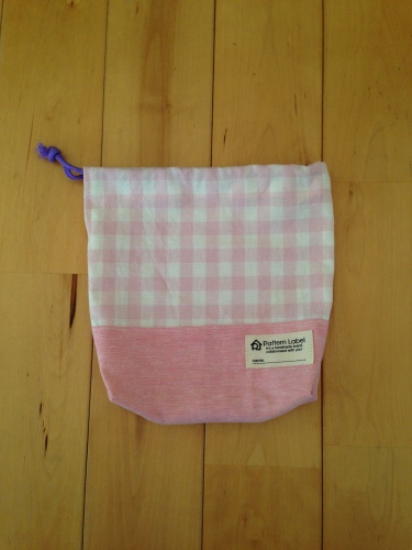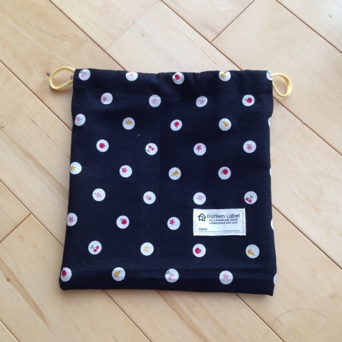 フラップショルダーの内布に使った布で、なわとび袋を作りました。普通の巾着にも、お名前タグをつけると、それだけでいい感じです。