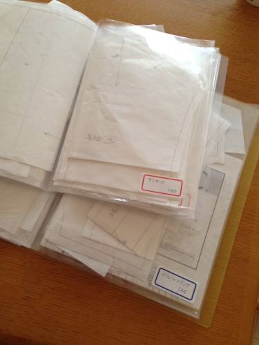 今まで、適当にポケットファイルに入れていた型紙、サイズ別に分け、ページに名前とサイズをラベリングしました。たったそれだけで、なんだか使いやすくて、戻しやすくなりました。布にあててみて、用尺が足りないと、別の型紙を当て直したりするので、戻しやすいことも重要です。