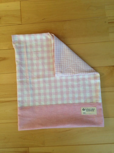 型紙 パターンレーベル 入園・入学バックセットより お着替え袋布地 C&S 綿麻 チェック2種類と無地 何かのセットもの?布山より発見された、かわいいピンクの綿麻布。表と裏でチェックの大きさが違います。紐が通してないですが、このあと、白色を通しました。