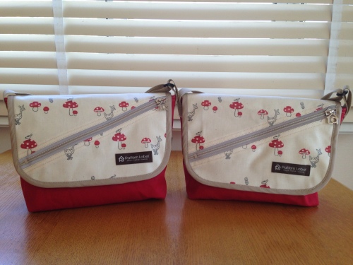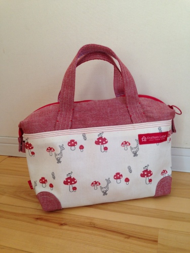 型紙 パターンレーベル フラップショルダーS布地 RickRack Shinzi Katoh つや消しラミネート 帆布 銀河工房 レッド ・資材 パターンレーベル ナチュラルまもなく誕生日の娘に、鞄を作りました。誕生日が3日違いの姪にも、おそろいで。1個目。ファスナーをつけると、上半分とした半分がずいぶんとずれてしまいました。なので、2個目製作は、真ん中のノッチを最重要視。3個あるノッチの左右が合わないのは気にせず。結果、ピッタリあいました。ただ、縫込みすぎて、フラップが5mmくらい短くなってしまいました。工程がすくないので、楽しく縫えました。最後のPPテープの厚みは、我が家の家庭用ミシンの限界点。押さえのギリギリすぎて、回転させて縫うのがきびしかったです。出来上がってみると、柄の出方がまったく同じ。完全に双子バックになりました。内布は黒に白のドット。ドットの中に小さくフルーツが印刷された柄です。
