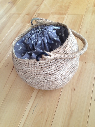 お気に入りのラフィアのかばん。本当は口がリボンでした。、でも中身が丸見えなので、夫から「財布取られるぞ」と使うたび注意されていました。車の中でころんころんすると、携帯を紛失したりもしていました。なので、カバンの口布をつけなければ!と思って何年たったのか。とうとう縫いました。巾着になりました。少し布が長すぎた感じはありますが、手縫いで本体に取り付けるのが、意外に時間がかかったので、直さずこのまま。これで安心して使えます。