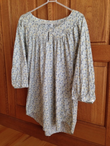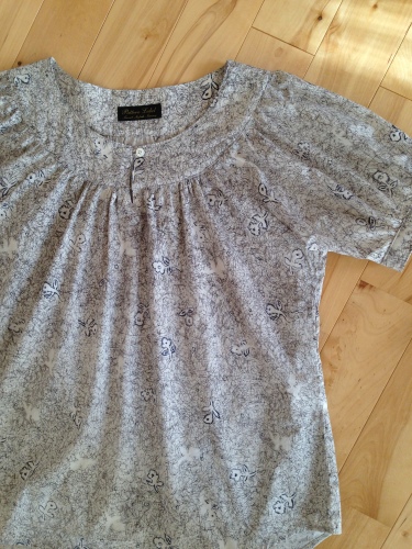 型紙 パターンレーベル ヨークワンピ ブラウスオプション布地 リバティ Eloise グレー×イエロー2年くらい前にワンピースを1着だけ縫った型紙を出してきました。今回はブラウスです。いっぱい失敗しました。前身頃の開きを後ろ身頃に作ってしまったり、(強引にふさぎました)ヨークを反対につけてしまったり。縫うより、圧倒的にほどく、ほどく、ほどく。3歩すすんで2歩さがる。そんな調子でなかなかすすまず、1週間くらいかかって縫いました。なので、完成は本当にうれしかったです。着てみた感想。ギャザーブラウスなのに、着やせ!!脇のくびれラインがいいのでしょうか?手持ちの他の型紙のものと、全然ちがいます。計算されたギャザー量。胸元にはギャザーがあるのに、お腹周りはギャザーが自然に消えてすっきり見えるんです。チュニック丈じゃないのもいい。最近、チュニックを着た自分がビデオに写っている姿を見て、あまりの醜さに愕然としたので。これからはブラウス丈で♪さんざん凹んだことも忘れ、もう1着作りたくなりました。