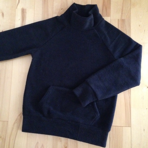 型紙 パターンレーベル スタンダードプルオーバー140布地 銀河工房 アンチピリングフリース ブラックずっと気になっていた毛玉の出来にくいというフリースを今更ながら買いました。ふわふわの毛足の長いフリース。肌ざわりがとってもよいです。が!!!この厚み。というか、毛足が長いから?縫いずれしまくって、私にとって、難しい布でした・・・。ポケットも縫い目がよれてしまって、ほどきたくても、毛足に縫い目が埋もれて、糸が捜索できず。でもって、4重に重なったところ、押さえにねじ込むのが大変で、泣きたくなりました。幸い、針の通りのよい生地だったので、ロックミシンはうなるものの、針が折れる災難には合わずにすみました。タートルネック、袖、裾すべて共布で作りましたが、伸縮性があり、ちゃんと着れました。