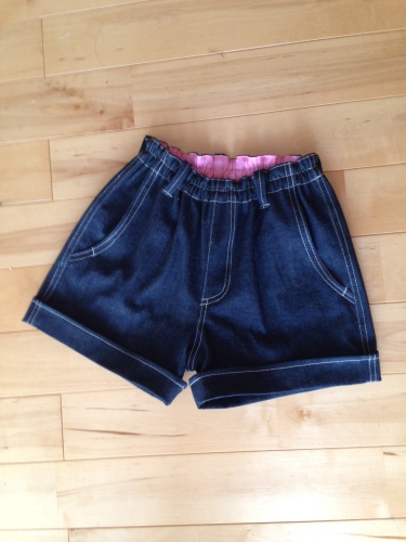 型紙 パターンレーベル キッズショートパンツ 140布地 マツケ ストレッチジーンズデニム ワンウォッシュ加工 ネイビー プロート ヒッコリーデニムはたしか11オンス?ストレッチデニムで、ショートパンツを作りました。後ろポケットは、ストパンのパッチポケットをヒッコリーの布でつけました。玉縁ポケットの方が、かっこよくて素敵なのですが、根気がなくて手抜きアレンジです。