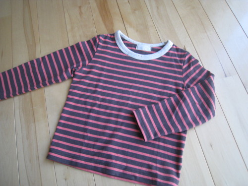 型紙 パターンレーベル キッズT100布地 大人服のリメイク昨年作ったキッズT。108cmの次女、今年ジャストサイズで着ています。昨年、発表会のオペレッタでの、泥棒さんの衣装が黒×白のボーダー柄だったため、このTシャツは「泥棒の服」と呼ばれています(笑)フレキシブルベストや、裏毛で作ったスィートT半袖を重ね着して着ています。