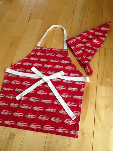 型紙 パターンレーベル キッズエプロンセット 110布地 echino mini car 綿麻キャンバス衝動買いした布で、キッズエプロンを作りました。ぼんやりしていたので、タグをつけ忘れました。失敗したのは、ネック布の裁断。「わ」で断たないといけないところをうっかり忘れて布が足りなくなってしまいました。生成りの別布で補いましたが、腰ひもとリンクして、これはこれでよかったかなと思います。布に厚みがあったので、逆に三角巾のゴム部分も、別布にしたほうがよかったかも。縫い代がけっこうゴロゴロしてます。糸はベージュ30番。縫い目は3mm。糸は赤の60番と迷いましたが、攻めてみました。画像を見ると、クリスマスカラーで、三角巾がサンタの帽子のようです。