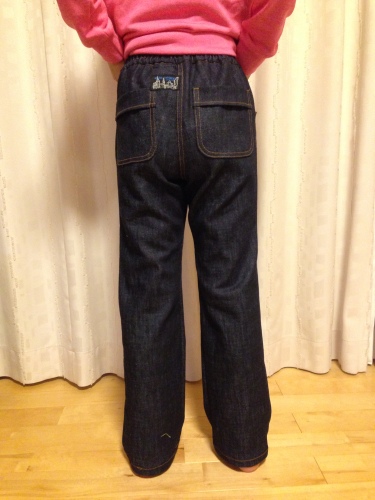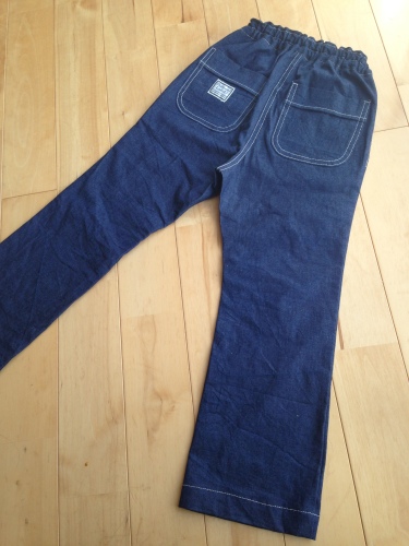 型紙 セミワイドパンツ 140布地 プロート 岡山の児島デニム 12オンス ムラ糸ストレッチ ワンウォッシュ加工裁断だけして放置されていたセミワイドパンツをやっと縫い上げました。このデニムは初めてで、サンプルでいただいた時に、布の柔らかさがすごく気になったので、1m注文しました。先日アップしたハンチングと同じ生地です。以前、同じ店で買った10.5オンスより厚みを感じず、縫いやすい布でした。織りがやわらかいので、裁断すると、端からほつれやすかったので、そこが注意点でした。ポケット完成後、切り込みすぎたのか角がほつれてきたので、変な場所にタグをつけてほつれ止め。お気に入りの6オンスのセミパンは、さすがにこの時期寒いので、12オンスのセミパン、暖かパンツでよろこばれました。下糸30番ネイビー上糸30番金茶タグ リサイクル