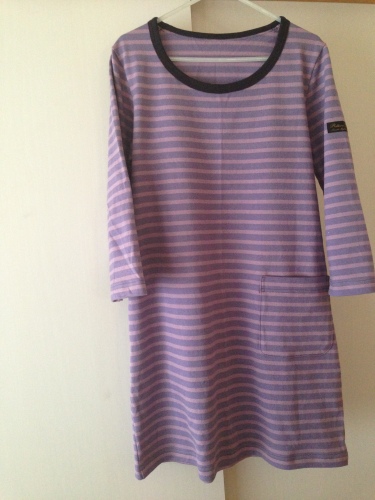 型紙 パターンレーベル デイリーワンピ布地 C&S 天竺ボーダー ダークラベンダー×ピンクラベンダー2年半前に裁断したものが、ようやく服になりました。7分袖、チュニック丈です。ポケットは丸底ポケットを1つ。右利きなのに、なぜか間違えて左側につけてしまいました。ネック布、迷いに迷って、濃い紫?茶色?何色かもはっきりしない、いつどこで買ったのかも覚えてないものを使いましたが、なんだか色が濃すぎたかも。でも、全体にぼんやりした色なので、引き締め効果にはなっているような。同じ布で、クチュリエTとこどものショルダーヨークTを過去に作っています。ギリギリ3着裁断したので、クチュリエTもデイリーワンピも7分袖。なので、寒いです。次に作るときは長袖にしなければ。今回も力を入れたところは、ネックのパイピング。丁寧にしっかりしつけ。そして、ボーダーの柄合わせ。ここが決まると、本当、服の愛着が高まります。