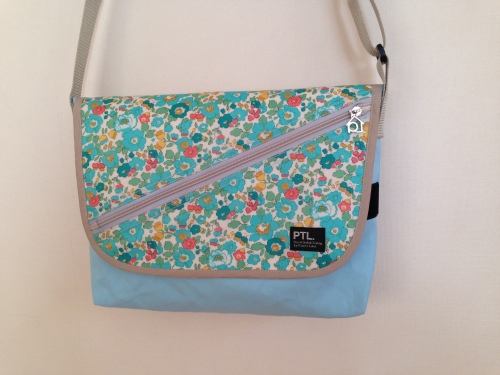 型紙 パターンレーベル フラップショルダー M布地 リバティ Betsy つや消しラミネート ・銀河工房 11号帆布 水色・生成りA4サイズのファイルを入れたくて、Mサイズで作りました。4個目のフラップショルダーです。ファスナーセットは、ナチュラルで。水色の帆布は娘のリクエストです。今回もフラップ部分のリバティ、地の色が透けるので、生成りを裏布に使っています。ファスナーポケットを開いた時に、縫い目が見えないよう、中布を1枚足しています。本体の裏地は黒地に生成りのドット。綿麻キャンバス。糸はベージュの30番。前回作ったSサイズは、容量が本当にちょうどよく、使いやすいのでヘビロテです。今回は週一の習い事用に作りました。1日で完成するうれしい型紙です。