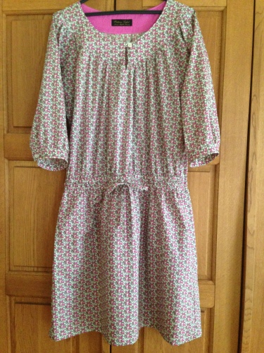 型紙 パターンレーベル ヨークワンピース OPブラウス布地 リバティ Unforgettable moment以前、ボリュームのあるスカートを作ったのですが、何度着てみてもやっぱり似合わないので、着るものに縫いなおすことにしました。まずは分解。嫌いな「ほどき」をがんばりました。スカートは三枚はぎにしていたので、型紙をあててみると、どうしても半袖しか取れませんでした。(仕上げたのは先月ですが)季節はずれの半袖です。難関はやっぱりヨーク。なんどやっても難しいです。今回は前回のミスをふまえ、裁断後最初に前みごろの開きを作りました。半袖は作業工程が一つ減るので、ヨークの難関を越えれば、あとは楽しく縫えました。半袖ですが、暖かな日はカーディガンをはおり着ています。何より着れない服が着れる服に復活できたことが、うれしいです。