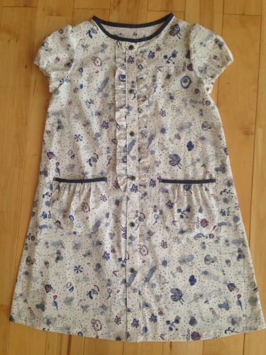 型紙 「まいにち着る女の子服」布地 リバティ Memories of Rain クリーム&ブルーパー 2010久しぶりのミシンです。姉のお下がりのワンピが大好きで、季節かまわず着倒している次女を見て、これは彼女のために仕立てなければ!!と思うこと一年。ようやく思い腰をあげました。型紙は大好き過ぎのこの本。もう、何着作ったことか。神パターンです。なのですが!!次女、もう小学二年生になりまして。サイズアウト。でも、どうしても同じ形で作りたい。無理やり補正して130サイズの型紙作りからスタート。これがけっこうハードル高くて、時間がかかりました。布は、一番お気に入りのもの。心を込めて、丁寧に縫いました。以下、気になった事。いつもリバティに上手に接着芯が貼れません。シワがよってしまう。接着芯も水通しすると縮みにくいと聞いて、水通ししたものを使いましたが、あまり変わらず。説明の次のページに図解が載っていたことを忘れ、文章のみ見ながら、怪しげに縫い進めたので、いくつか失敗を。フリルをのせた後、しつけをするよう図解が書かれていたのを見落としてたので、まち針で止めただけで縫いました。すると、見事にフリル終わりが左右1センチもずれてる!!ショック。前たてのステッチがうまく縫えたのに。これは気になる。右前はフリル側から前たてにステッチをいれ、左前は最後にフリルを縫うので、縫いずれするのだと思います。たしか、前回も同じミスをしていることを、ミスしてから気がつきました。泣く泣く解きました。あと、フリルはギャザーをよせたあと、縫い代部分の膨らみをしっかりアイロンで押さえておくと、縫いやすいです。途中、何度か下糸をまき直していたのですが、完成してみると、あれ?糸の色が生成りだったり、オフホワイトだったり。めちゃめちゃ気になる(涙)最後の最後、ネックのバイアスを裁断ミスで全然寸足らず。「嘘でしょ~!!」無理くりつなげて、継ぎ目に泣きながら、縫い終わったら、一番目立つところに、またもや継ぎ目が。これは、バイアステープの元からあった継ぎ目が正面にきてしまいました。そして、継ぎ目に気をとられ過ぎて、バイアスを伸ばしながら縫うのを忘れてしまった。なんだか、衿が立ってる。最後のツメが甘すぎる。でも、完成間近なまま、買い物へ行くまで待てず強行。腕の太い次女に、パフ袖のゴムはソフトなものを、長めに入れました。長女から、「夏は暑いから、パフより、 ひらひらのほうが涼しいんだよね」とアドバイスも受けましたが、やっぱりパフは譲らず。それでもなんとか完成させると、布力のおかげで、素敵なワンピースに。「ねえ、ねえ、すぐ着てみて!!」と試着を急かす私と対照的に、「え~、今は無理。」と、冷たく拒否されました。さみしい。すごく日焼けした彼女に、果たして似合うのか!?と心配しましたが、めちゃくちゃ可愛かったです。でも、ぽっちゃりで身長は低めなので、丈が長すぎました。丈とフリルは120サイズで作ると、今の彼女にぴったりのようです。でも、身長はすぐ伸びるので、今回はこのままで。ボタンは黒蝶貝の黒。11.5mm。布が服になるって、やっぱり楽しい♪久しぶりのソーイングタイム。満喫しました。着ている姿を見るのもうれしいです。ブログは久しぶり過ぎて、文章のリズムが悪く、変な感じです。最後に次女から感想「もう、超お気に入りだよ」