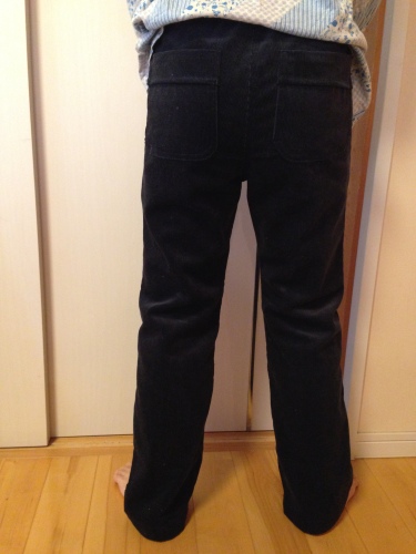 型紙 パターンレーベル セミワイドパンツ 140布地 C&S コーデュロイ ブラック暖かいパンツ2号です。でも、ストレッチパンツの方がよいらしいです。だったらハーフ丈で作って、ハイソックスを合わせた方がいいのかな?まだネイビーの布が眠ってます・・・。針14番糸30番 ネイビー