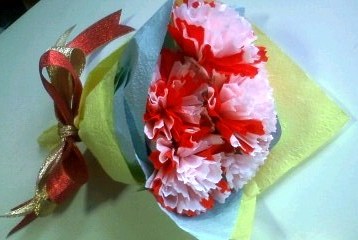 おはようございます。昨日は母の日でしたね。歩いて5分に住んでいる母と一緒に食事にいってきました。やっぱり同じように考えている方は多くてお店はすごい混雑でしたね。しかもお店で実家のはす向かいのご家族にあってしまい(お店は車で15分くらいのとこなのに)さらに驚きなのが隣のテーブルでしたぁ。こんな場所であうとお互いなんだか恥ずかしくて挨拶程度で失礼しちゃいました。今年は、カーネーションを手作りしてみました。素材は和紙です。写真でみると1つみたいですが6本ほどを花束にしてみました。そして、今日、母はお誕生日です。おめでとう!!!最後までお付き合いくださったありがとうございます。みなさんに沢山の幸せが降ってきますように。