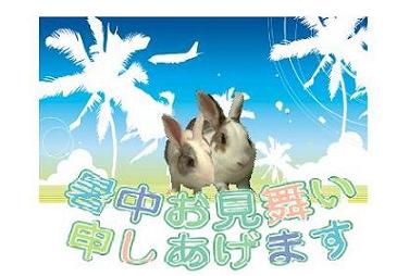 茶香ママのお友達さん仲良くしてくれる*:..。o○☆ うさぎさん&うさ飼いさん *:..。o○☆の皆様へ暑中お見舞い申し上げます明日からとうとう8月です暑いのはとっても苦手なぼく達ですが、茶香ママの口癖の「気合と根性」で乗りきっちゃいます皆さんも熱いお病気(熱中症)に気をつけて夏を楽しんじゃってくださいねこれからも、宜しくです*:..。o○☆ *:..。o○☆ 茶々丸&小鉄より *:..。o○☆ *:..。o○☆