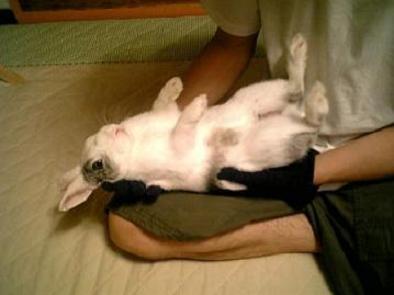 先日の事我が家のうさ達にとって、とうとう恐怖の日がやってきてしまいましたそれは・・・ミッション名「~TUMEKIRI~」このミッションは、我が家の給料日(25日)前後、旦那たんのお休みの日にいつも決行される事になっている・・・とちょっとカッコつけてみましたが、ようするに爪きりの日ですまずは小鉄(すごい目が見開いちゃってます)小鉄>まさかっ・・こっこの体勢は・・爪きりこのように旦那たんが仰向けに抱きかかえ、茶香が爪を切ります仰向けにすると平衡感覚が失われ、爪が切りやすいとの先生に教わりましたですが・・・小鉄は腹筋が鍛えられているので、このような体勢からでもすごい抵抗にあってしまいますとにかく、根気よく、少しづつ、神経を傷つけないよ~~に、慎重~~に切ります・・・すごく時間がかかります疲れます・・・(もう、いつも汗だくです)気を取り直して、次は茶々丸の番茶々丸>何離してよ~まったく、抵抗をうけないってわけではないのですが茶々丸は小鉄とちがって、腹筋が弱いので抵抗むなしく、グテ~ってなっちゃってます結局は・・・茶々丸>もう、好きにして・・・このように大人しく前抱っこされ無事、爪きりミッション終了しました