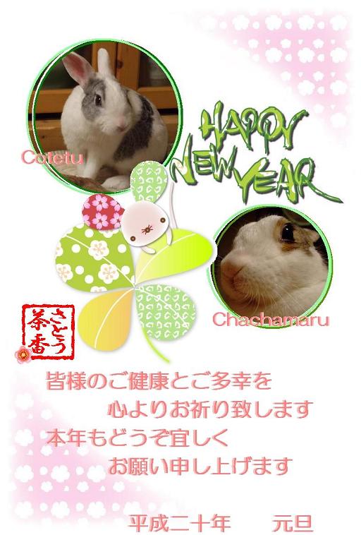 ~皆さん、大変ご無沙汰でございます~仕事の忙しさにかまけて、とうとう年を越すほどブログをサボってしまいました・・・さとう茶香でございます改めまして、新年、明けましておめでとうございます今年もうさ達共々、どうぞ宜しくお願いいたします思い起こせば昨年、忙しい七五三のシーズンを終え、ようやくブログを再開~と思っていたら、年末のバタバタで、またまた再開が遅れ・・・こうなったら新年のご挨拶でブログを再開させていただこう~と本日に至った次第でございまする~本当に皆様、ご無沙汰ばかりの茶香ではございますが、今後とも、ぜひとも仲良くしてやって下さいませ そうそう、私事ではありますが近況を少し・・・実は今年の9月から、茶香は某子供写真スタジオで、おもに着付けとヘアーアレンジのお仕事をさせてもらっておりました。とにかく・・・めちゃくちゃ忙しかったの一言につきる~可愛い子供達に若さを分けてもらいたかったんですが、全ての生気を吸い取られた感がある・・・・・・のは茶香の気のせいかしら~いやぁ~無邪気な子供達のパワーは、本当にすさまじい世の中のお子様がいらっしゃるお母様、保育士さんや先生・・・とにかく、子供さんに携わるお仕事をされてる皆さん本当にご苦労様です私、茶香は心から尊敬いたしますわ・・・・・・注)抜け殻だった茶香を想像して、もう初笑してやって下さいませ~でも、約4ヶ月弱、忙しくて大変でしたが、本当に楽しかったお仕事でした。残念ながら短期のお仕事だったので、昨年22日で最後となってしまいましたが、また繁忙期にお邪魔できたらいいなぁとも考えております。とりあえずはお正月を堪能して、また新しくお仕事を探すつもりです。うさ達と戯れながら、しばらくのんびりさせてもらおうと思っています。あっ茶々丸も小鉄もいたって元気ですよ~寒くなってコタツを出したら出たり入ったり出たり入ったり・・・新調したコタツ布団をカミカミホリホリ・・・茶々丸にいたってはコタツの中でよく丸くなっておりますし、小鉄は・・・ハロゲンの前でこんな感じ・・・です(笑とにかく毎日、元気いっぱいのうさ兄弟でございますのちほど、お友達の皆さんのトコにも新年のご挨拶とともに、遊びにお邪魔させてもらいますねでは、2008年が皆さんにとって、幸多き年となりますように、心からお祈りいたしております。