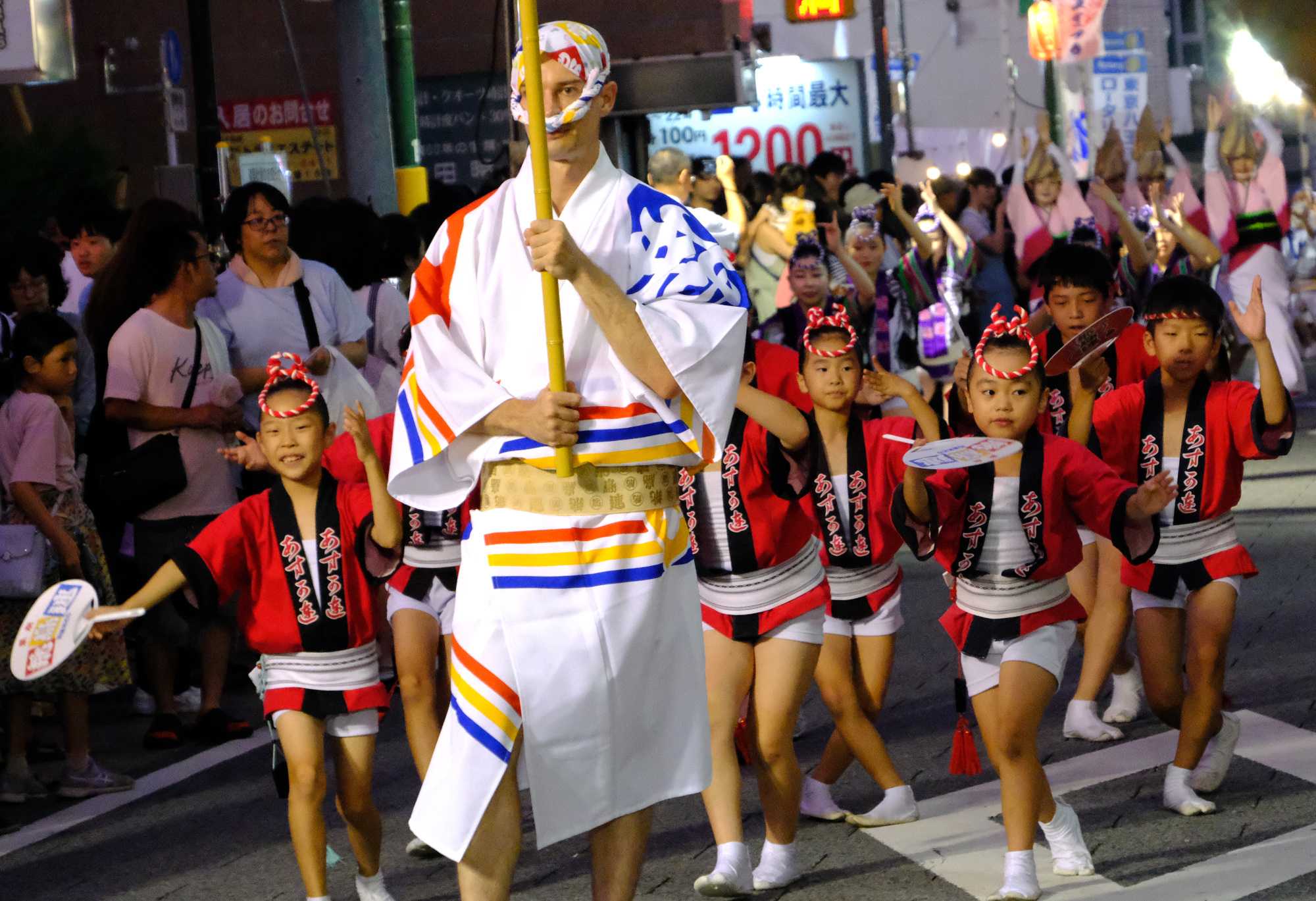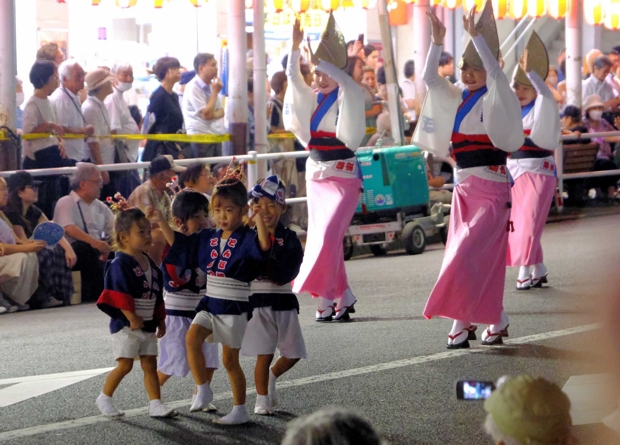楽しい阿波踊りも、今回で最終です。夜も深まり?だいぶ暗くなってきました。前々回に紹介した蜻蛉連がここ(広いところ)に登場です。ちびっこたちと女踊りの方々。阿波踊りで好きなものには、掛け声があります。♪ヤットサー ア ヤットヤット♪ はよく耳にします。「ヤットサー」というのは、「久しい間」を意味しており相手に「お久しぶり」と挨拶するような意味合いがあるそうです。それに対して「ヤットヤット」と返すようです。蜻蛉連の子供の表情が良い。男踊りのこの女性もやっぱり目につきました。(#^^#)笑顔が美しい。(#^^#)阿波踊りといえば、♪同じあほなら踊らなそんそん♪というのが有名なようですが、実際にはあまり耳にしません。一番好きな掛け声は以下です。♪(前略)一かけ二かけ三かけて四(し)かけた踊りは止められぬ五かけ六かけ七かけて八(や)っぱり踊りは止められぬ (後略)♪ここからは(前にも狭い道で見た)飛鳥連です。子供たちの上手な踊り。そして若い女の子の男踊りもうまい。飛鳥連はこの女性たちの男踊りが魅力的でした。男性の男踊りは、人数も少なめで年齢層も少し高そうでした。('◇')ゞ最後に、元の狭い道の方の踊りを少し見て帰ることにしました。今回は見ていなかった南粋(なんすい)連です。女踊りの間を男踊りの人たちがすごい速さで駆け抜けていきました。みなさん、向こうへ。また戻ってきて・・・このあたりが見せ場でしょうか。とても動きの良い・・・切れ味のよい男踊りの方がいました。どうも女性のようでした。(#^^#)大勢の人の中で長時間立ちっぱなしでとても疲れたので、ここで帰路につきました。(おしまい)修理に出していたPCが戻ってきました。その件については、またの機会に書いてみます。