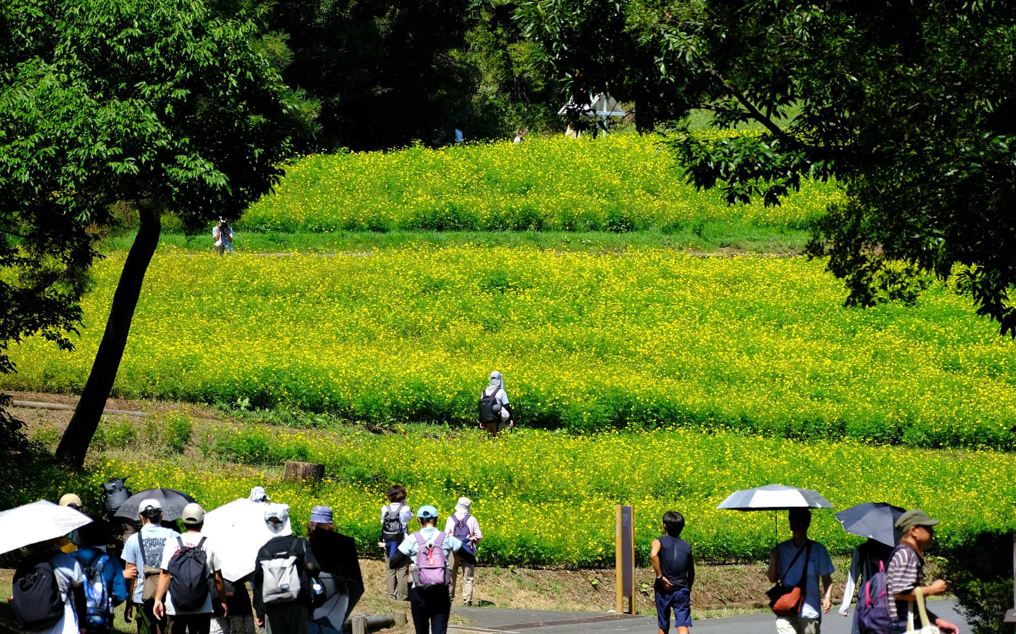 昭和記念公園では、今年は暑さのせいでキバナコスモスが早く咲いたようです。黄色いレモンブライト一色の丘に行きました。ただ、例年に比べると一つ一つの花があまりよくないような気がしました。この暑さではやむを得ないことなのでしょう。9月6日です。続々とレモンブライトを目指す人たちが行く。日傘が必要な暑さでした。黄色い花園の中に三々五々。黄色い花の中に黄色いドアが。この日は、暑かったものの空や雲はすがすがしく感じました。青空の下のレモンブライト群。透過光の一輪。それぞれの高さに。まだつぼみもありますね。黄色いドアあたりをめざしましょう。はい、これです。(#^^#)黒いワンちゃんが二匹。扇風機付き、サンバイザー?もしっかりかぶっていましたが、暑くてお口を開けてベロだし状態。('◇')ゞあ、さっきのわんちゃんたちだ。広角レンズをもっていかなかったので、スマホで。これも、スマホ写真です。