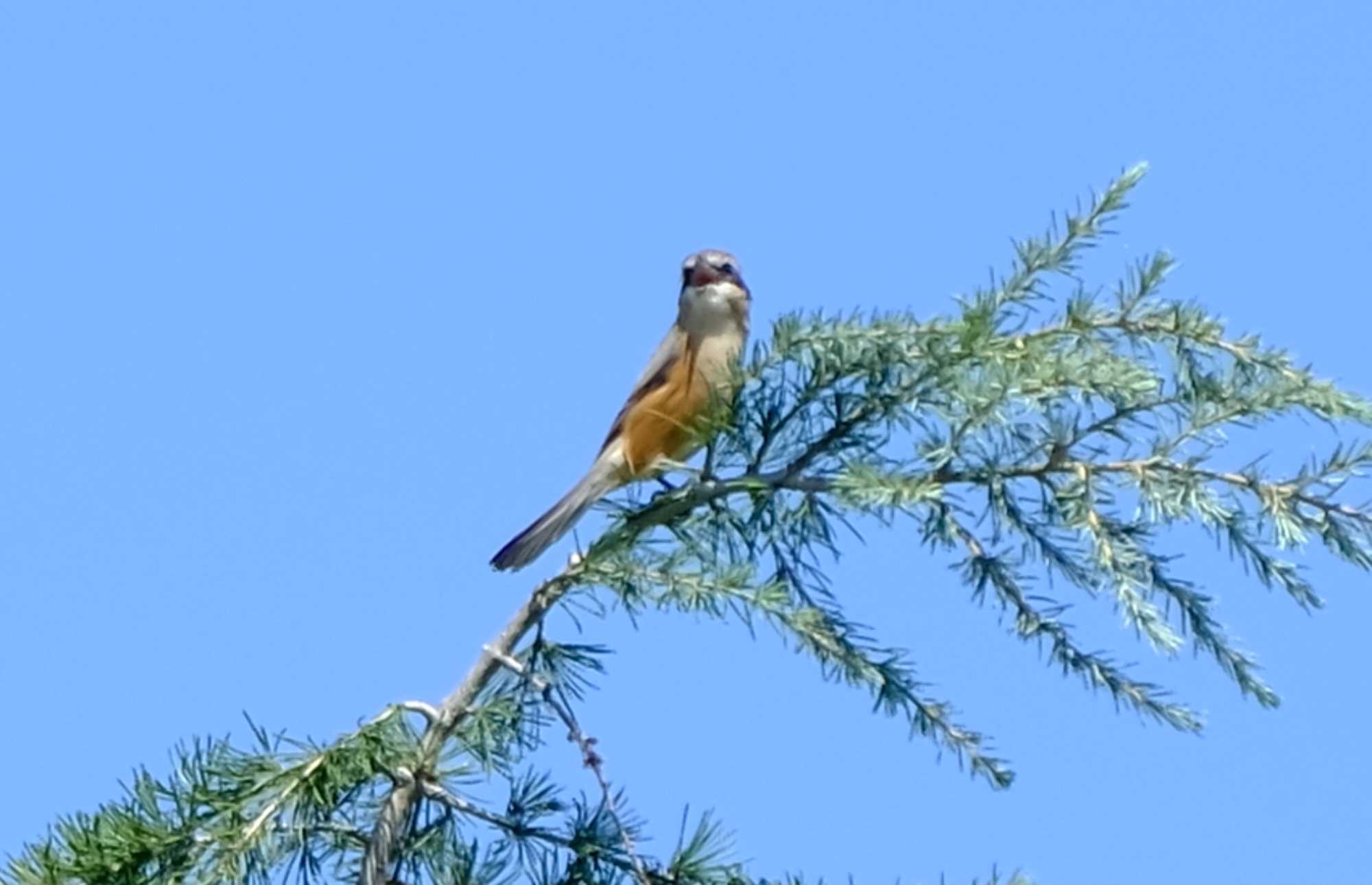 久しぶりに野鳥に会えました。遠くでモズの声がします。どこだろうと、上の方を探しました。秋のモズは高いところに止まって大きな声で鳴くからです。ものすごく高い木のてっぺんにいました。モズのオスですね。大きな口をあけて鳴いています。このモズの高鳴きを聞くと秋だなと思います。おや、トンボが接近。('◇')ゞちょっと遠くを見たと思ったら、飛んでしまいました。別の日別の場所でも、モズの高鳴きが。木でなくても、高いところならなんでもよいようです。( ^)o(^ )なんとコブシが咲いているのを目撃しました。今、春じゃないよね?何輪も咲いているうえ、つぼみもありました。どういうこっちゃ?