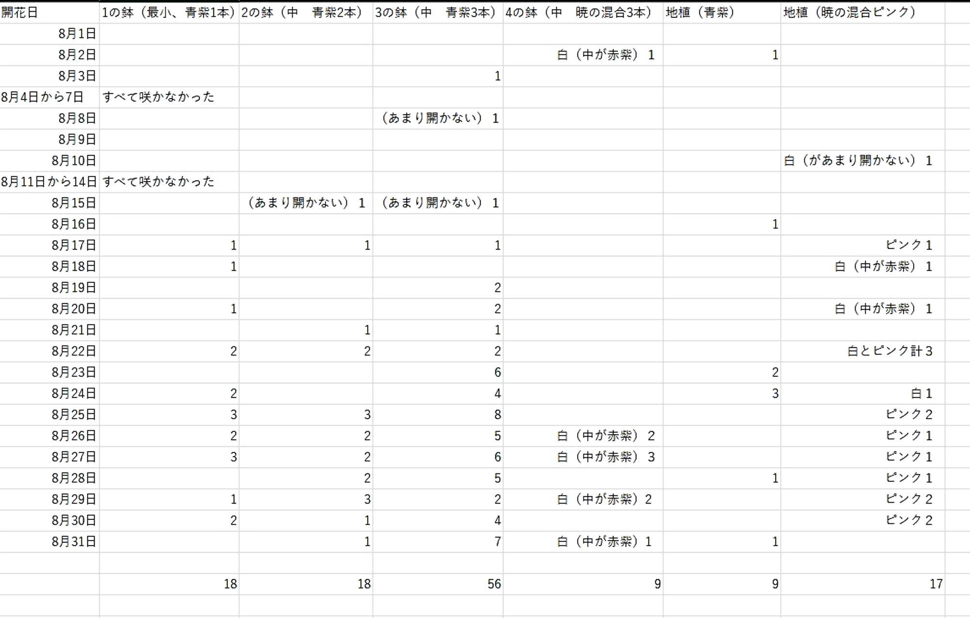 8月も終わりました。何と熱い月だったのでしょうか。庭の朝顔の開花数のまとめも終わりました。8月は4日から7日までと、11日から14日までは一つも咲きませんでした。こんなこともあるのですね。そして、その後は急にたくさん咲くようになりました。特に3の鉢が多いのは、その鉢だけ3本植えてあるからです。1の鉢は鉢の大きさが小さすぎました。「暁の混合」という種からは、今年はピンクと、真ん中が赤紫の白しか咲きませんでした。しかも、白は、ほぼ完全には開けないものばかりでした。去年咲いてくれてうれしかった団十郎色のは、一つも咲きませんでした。たまに、こんなへんてこなのもありました。(;´∀`)小さい1の鉢に咲いた白い縁のある青紫二輪。2と3の鉢は青紫でも白い縁はありません。種はまきませんでしたが、今年も出てきた小さな朝顔。2の鉢は8月中旬には早くも種ができました。8月下旬に三つほど種をとりました。去年は12月になってやっととれた種も多かったです。ふんわりと。地植えの青紫の大きめの花と、小さい朝顔。花の中にハチさんが入っていきました。なかなか出てこなくて、やっと出てきたところを。今年はまともに開かなかった白い朝顔(真ん中は赤紫)。裏から見えるところがあって、そこから撮りました。さて、来年は種まきをどうしようかな?もっとも、まだ9月になっても朝顔は咲きそうです。