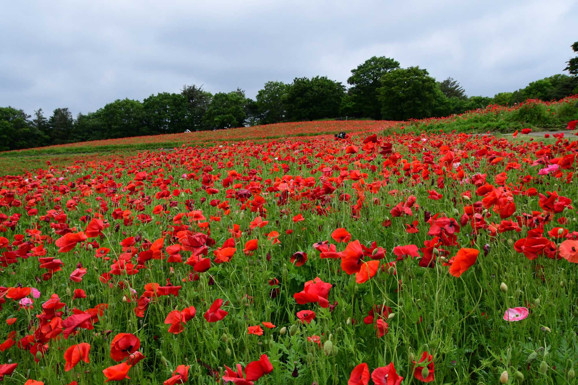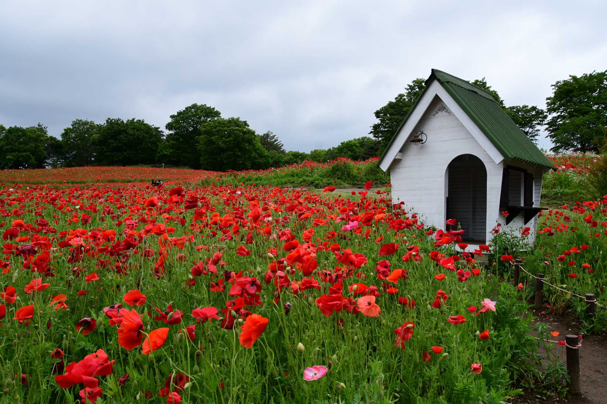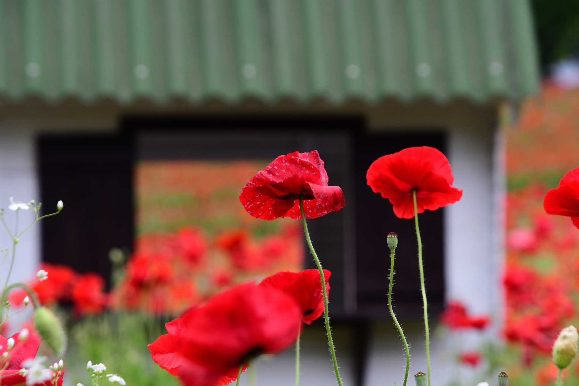 今年の花の丘はシャレーポピーの赤とカスミソウの白です。