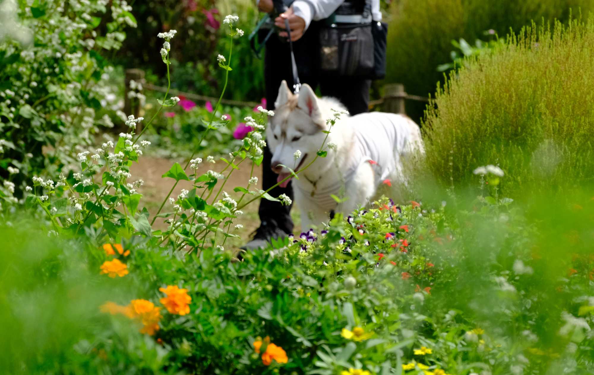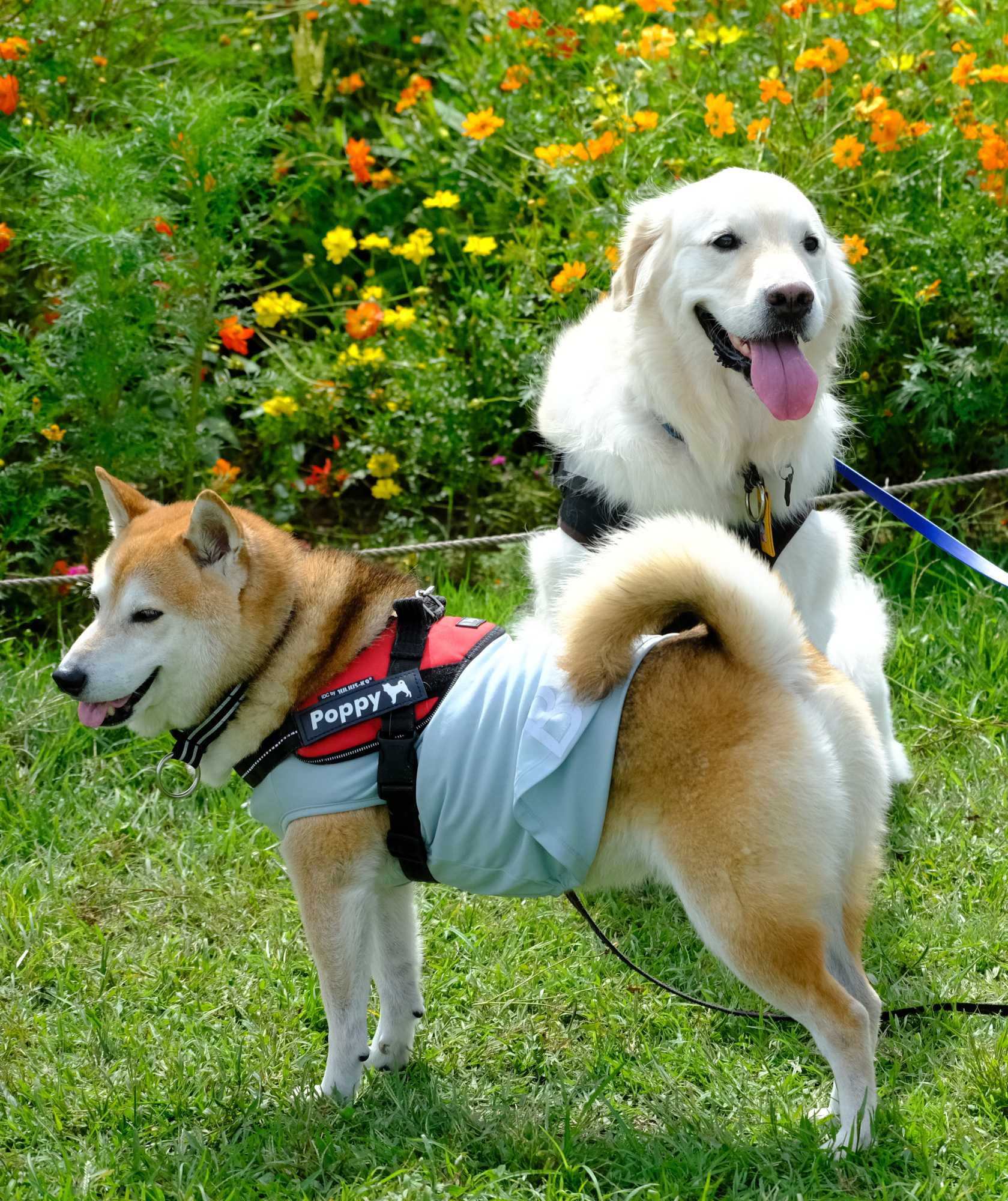 キバナコスモスの前で二匹のかわいいワンちゃんが。(#^^#)