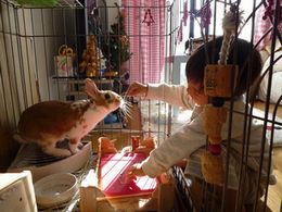 ペペロンチーノたちがご縁でお世話になった方がお手伝いされている、「猫の幼稚園」さんの猫ちゃんたちに、会いに行ってきました。幼稚園なので、授業参観です(^^)複数のちびちゃんたちが卒園した後だったようで、まったりと楽しく過ごさせていただきました。素敵な家族のお迎えを待っている保護猫ちゃんたちがいます。そして現在、「うさぎちゃん」という仮名の猫ちゃん(笑)が、新しい家族のお迎えを待っています。うさぎのように跳ねていましたよ♪詳しくは、コチラ猫の幼稚園をご覧下さい。抱っこしてますよ~♪この日、黒いサビちゃんは、素敵なお家のコになりました。良かったね。透明の棚、下から様子が見れます~おりこうさんの番頭さん(でしたよね?)愛想の良い専務さん。お話を聞いてます(^^)ゴロゴロしている猫ちゃんを見ているだけで、癒されました。猫ちゃんと暮らすための工夫もされていて、参考になりましたよ。代表の方やスタッフさんともお話をさせていただき、色々勉強させてもらいました。猫ちゃんと暮らしたいという方がいらっしゃいましたら、ぜひ選択肢の中にお入れ下さいね。うちと同じく、各地のフリマにも参加されていて、売り上げは保護猫ちゃんの治療費等に使用されています。オリジナルのポストカードはトロケルくらい(笑)カワイイですよ。こちらもどうぞよろしくお願いします。うちのうさぎちゃんたちも、がんばらねばぁ~うさぎSUMMITサイト仔猫の成長記録ブログもよろしくお願いします。がんばれ!ペペロンチーノ♪バナーも作ってみたりなんかしました。